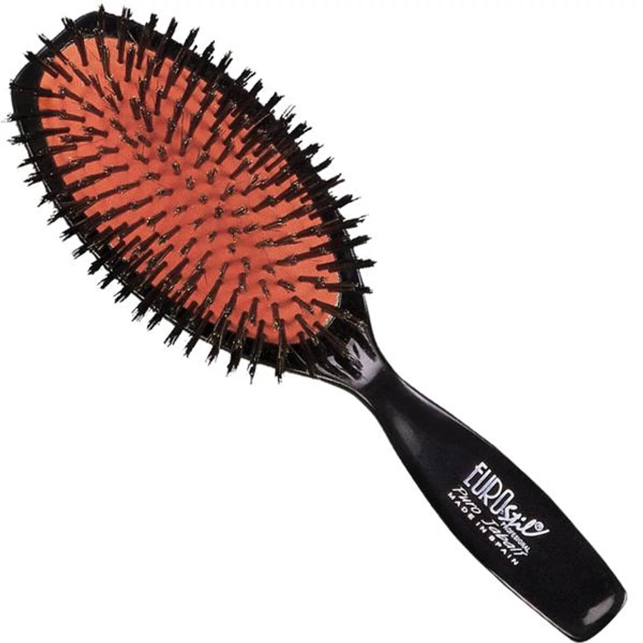 Vaddisznósörte hajkibontó kefe, ,,kiálló vezető TÜSKÉK nélküli " vaddisznó sörtével, ovális pneumatikus párnával, fekete antisztatikus műanyag nyéllel, házzal.