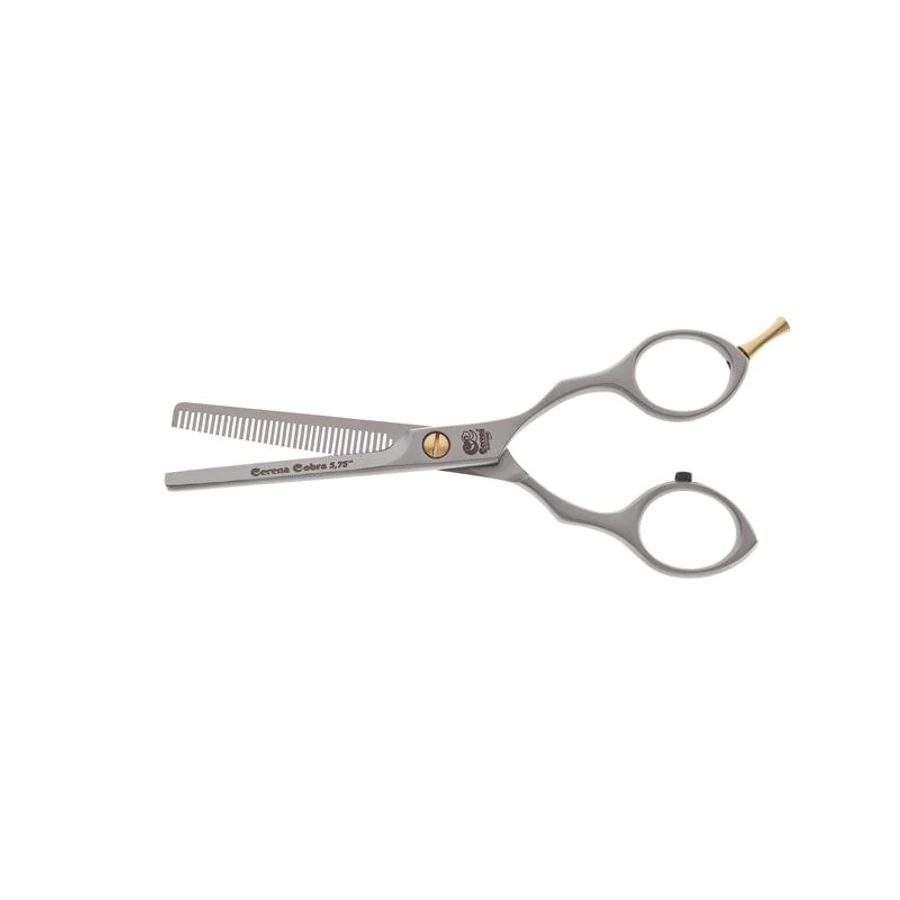 Ritkító hajvágó olló. Cobra5,75" Ergonómikus kialakítású fodrászkellék. A Cerena Solingen, texturizáló hajvágó olló, mikro fogazású ( önélezős ) vágó éllel rendelkezik. A hajvágó olló, Solingeni acélból készült, éle, és tartóssága a márkától elvárhatóan alkalmassá teszi fodrász munkaeszközként való használatra. A hajvágó olló állítható csavaros szorító rendszerrel készül. A csavar teljes kicsavarásával az olló pengék szétválaszthatóak, ezért szükség esetén azok újra élezhetők.